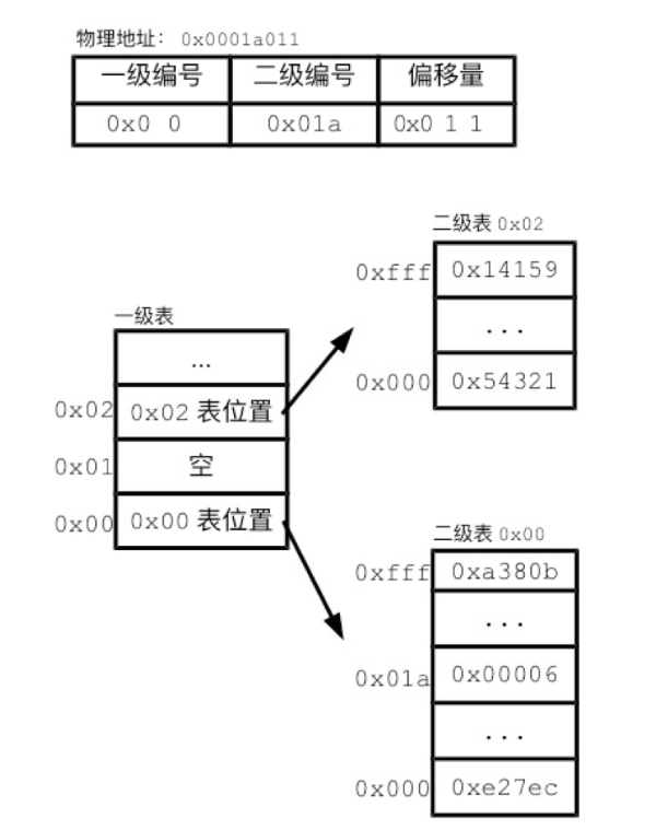 在圖 3 的例子中,頁編號分成了兩級。第一級對應(yīng)了前 8 位頁編號,用 2 個十六進制數(shù)字表示。第二級對應(yīng)了后 12 位頁編號,用 3 個十六進制編號。二級表記錄有對應(yīng)的物理頁,即保存了真正的分頁記錄。二級表有很多張,每個二級表分頁記錄對應(yīng)的虛擬地址前 8 位都相同。比如二級表 0x00,里面記錄的前 8 位都是 0x00。翻譯地址的過程要跨越兩級。我們先取地址的前 8 位,在一級表中找到對應(yīng)記錄。該記錄會告訴我們,目標二級表在內(nèi)存中的位置。我們再在二級表中,通過虛擬地址的后 12 位,找到分頁記錄,從而最終找到物理地址。