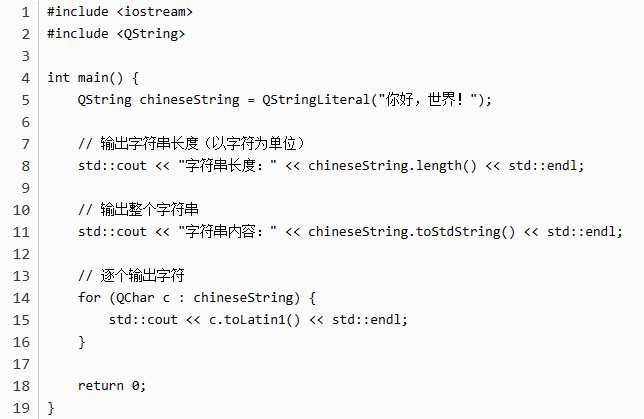 這個(gè)例子中,我們首先使用 QStringLiteral 宏創(chuàng)建一個(gè) QString 對(duì)象來(lái)存儲(chǔ)中文字符串。然后,我們可以使用 length() 函數(shù)獲取字符串長(zhǎng)度(以字符為單位),使用 toStdString() 將 QString 轉(zhuǎn)換為標(biāo)準(zhǔn)字符串并輸出整個(gè)字符串。最后,我們使用 for 循環(huán)逐個(gè)輸出字符,通過(guò) toLatin1() 將字符轉(zhuǎn)換為 Latin-1 編碼以便輸出。