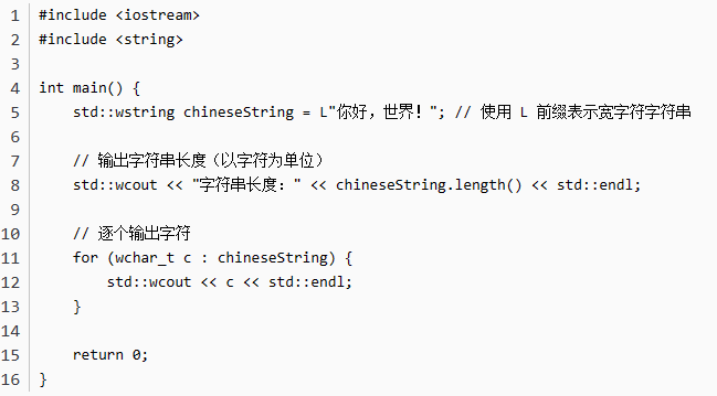 這個(gè)例子中,我們首先使用 L 前綴創(chuàng)建一個(gè) std::wstring 對(duì)象來(lái)存儲(chǔ)中文字符串。然后,我們可以使用 length() 函數(shù)獲取字符串長(zhǎng)度(以字符為單位),并使用 for 循環(huán)逐個(gè)輸出字符。