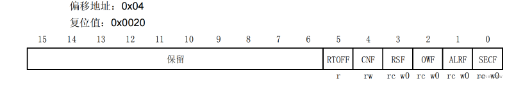 位4(CNF):配置標(biāo)志。(只有當(dāng)此位在被置’1’并重新由軟件清’0’后,從而允許向RTC_CNT、RTC_ALR或RTC_PRL寄存器寫入數(shù)據(jù))